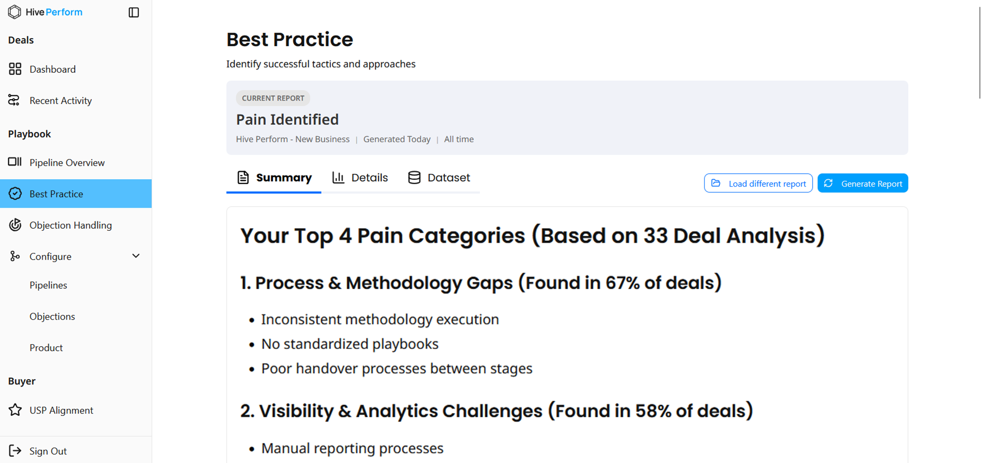 Get clear visibility into what’s driving success across your sales motions with Best Practice Reports. These reports analyse successful tactics, talk tracks, and deal behaviors across your pipeline, helping teams identify what consistently works.